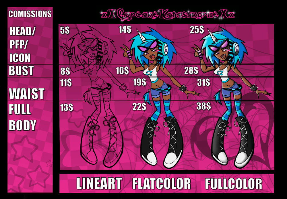 -Scenery type backgroundsI am allowed to deny a request for any reason, regardless if it doesn’t fit under any of the will-not category. This includes being disrespectful to me or rushing while the piece is being made or being uncomfortableDepending on the complexity of the design, prices may increase (may also decline if too complex)